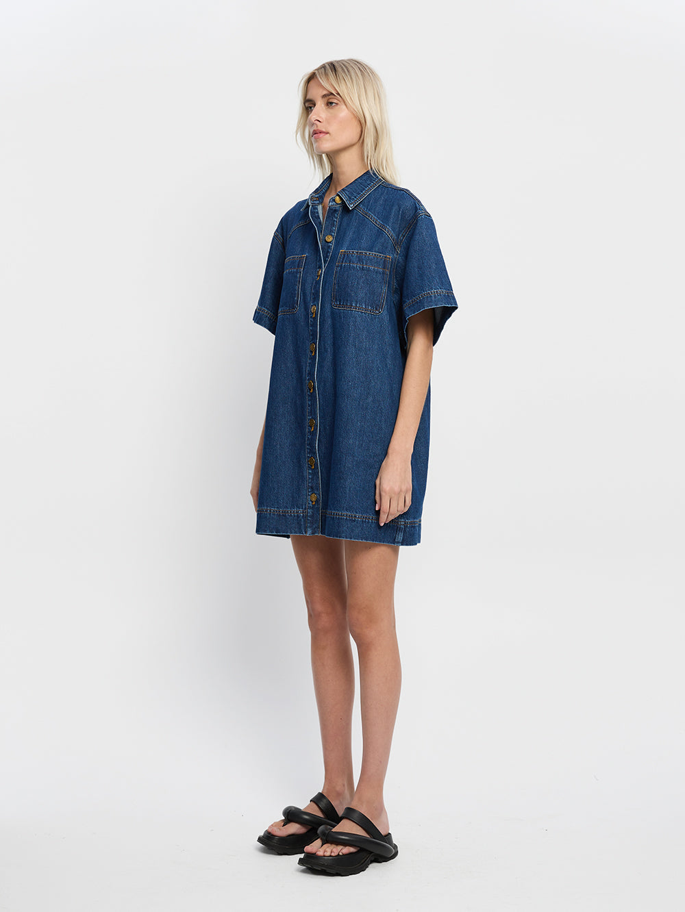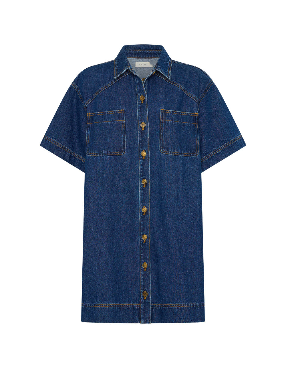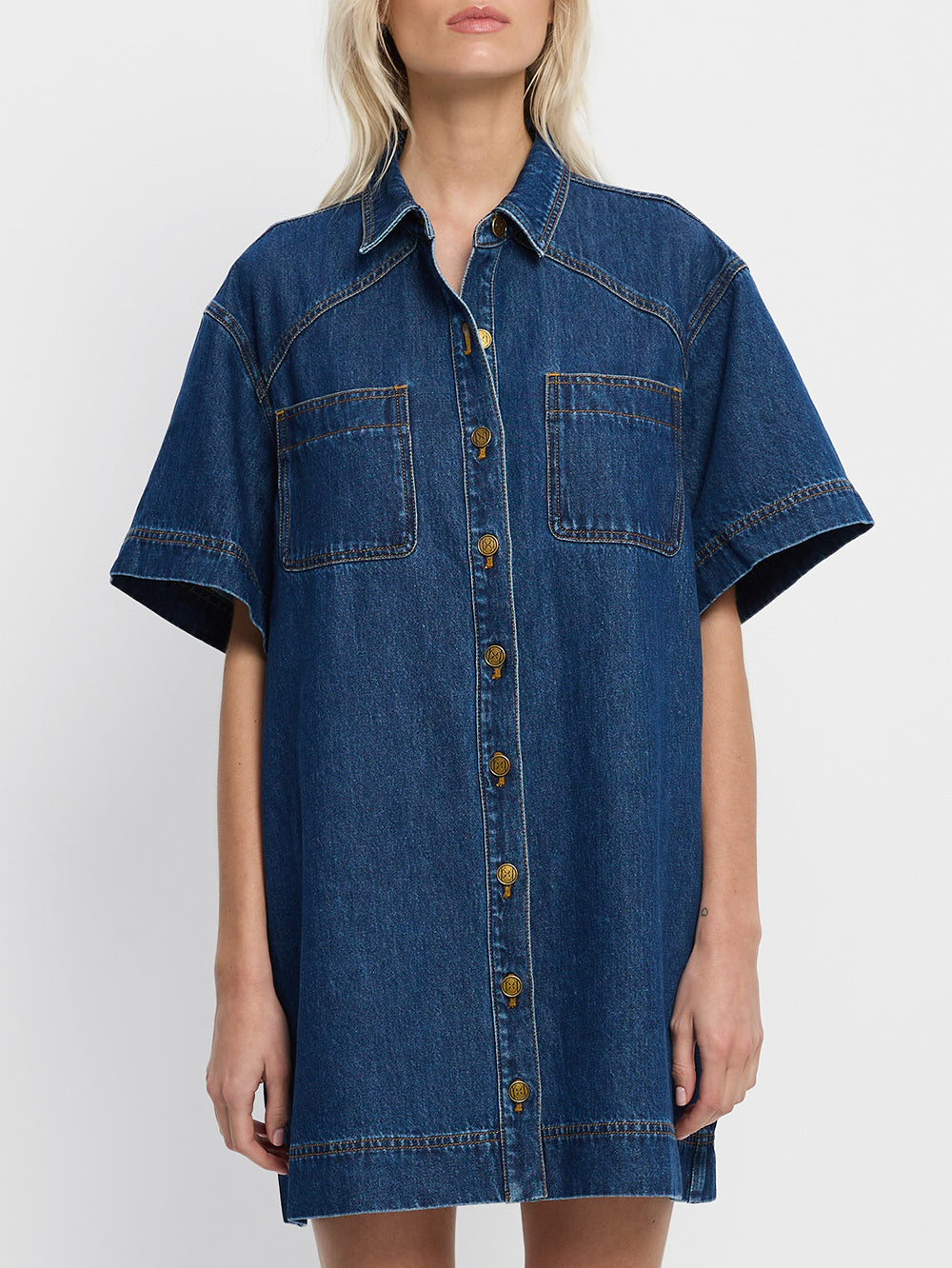 The Jada Mini Dress in an indigo hue is a relaxed oversized shirt dress silhouette and features a button through front, patch pockets, contrast topstitching detail, complete with signature gold hardware.