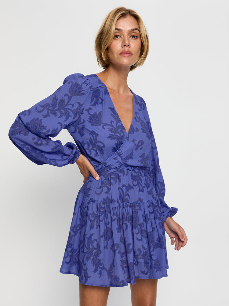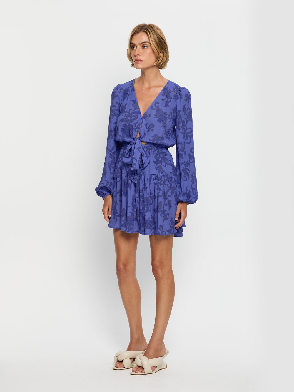 Jamie is two-toned blue florals on a soft royal base. The Jamie Tie Front dress features a tie front bodice, complete with a gathered hem frill.