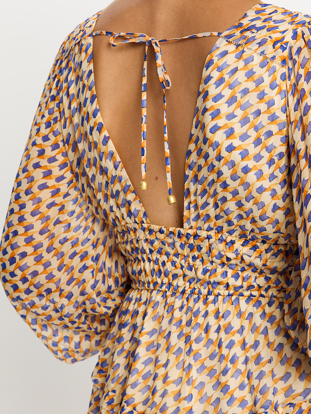 Rochelle is a soft geometric print in blues and neutral tones. The Rochelle Mini Dress features a V-neckline, gathered hem frill skirt, complete with adjustable drawcord at waist.