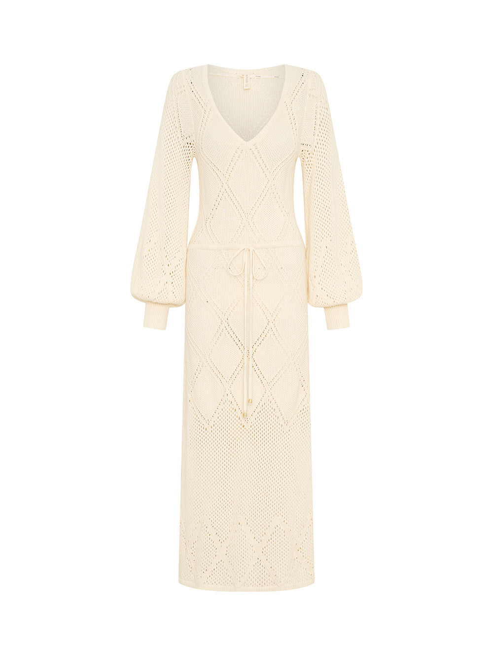 The Samara Knit Dress in cream is crafted in an intricate diamond design featuring a V-neckline, long sleeves, side splits and complete with an adjustable waist tie.