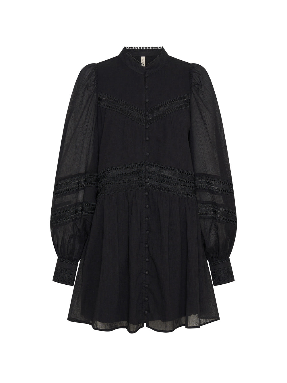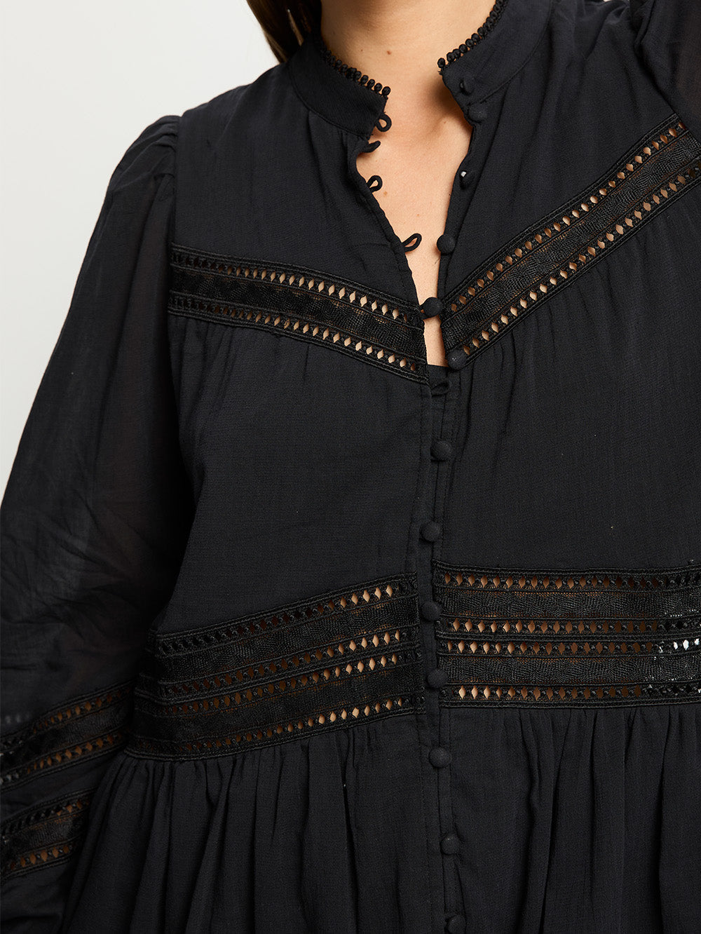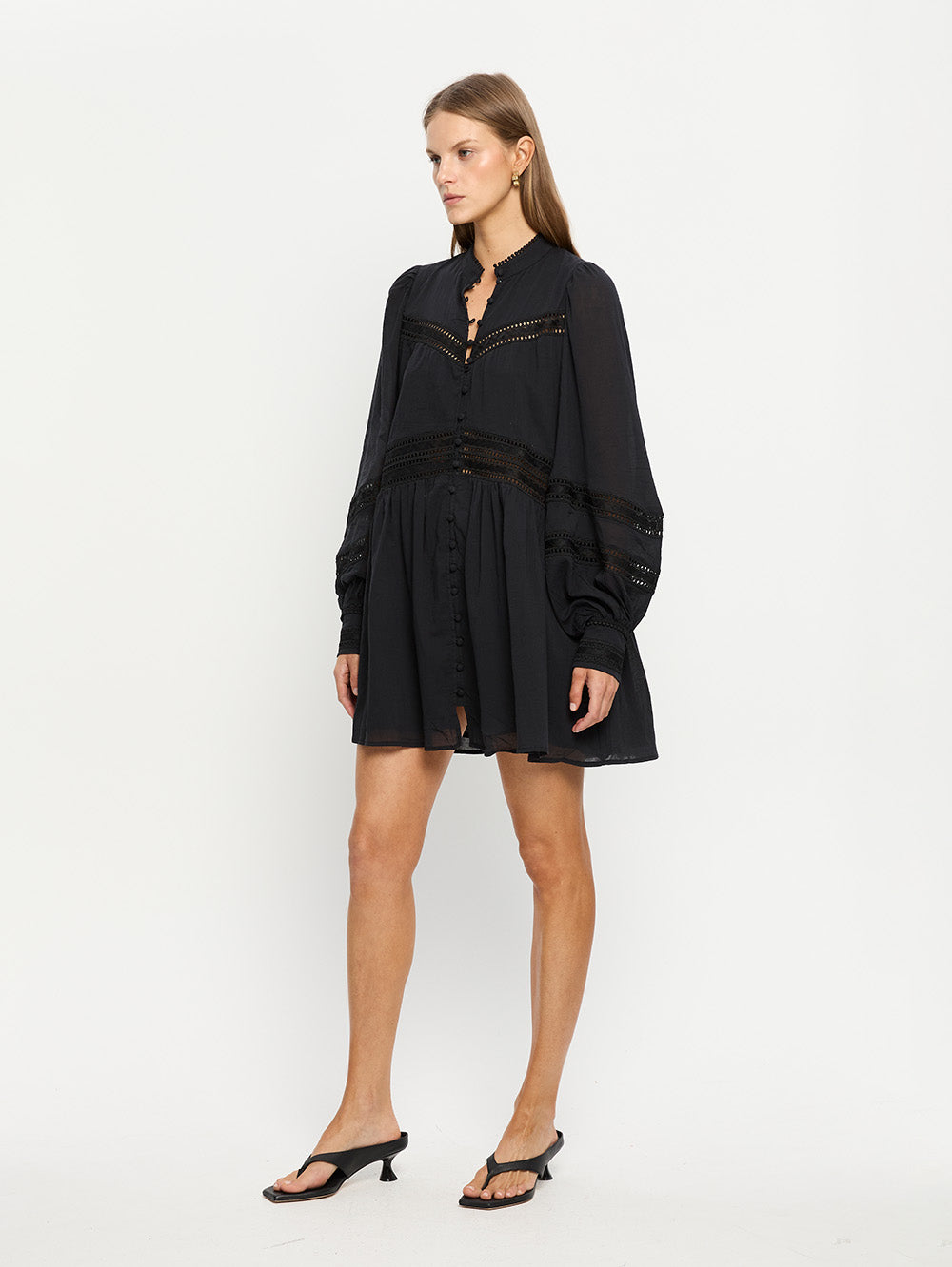The Tana Mini Dress in black features a stand collar and cuff with lace edging, a button down front, complete with lace panels throughout.